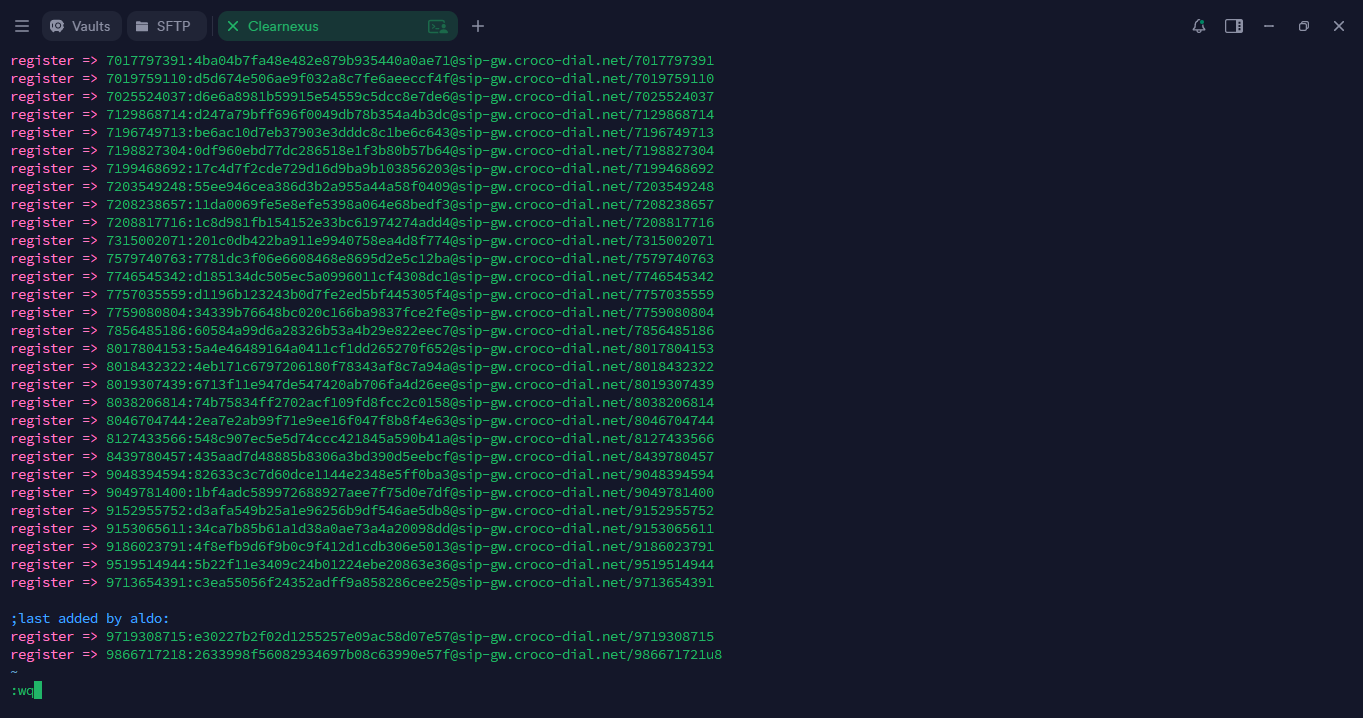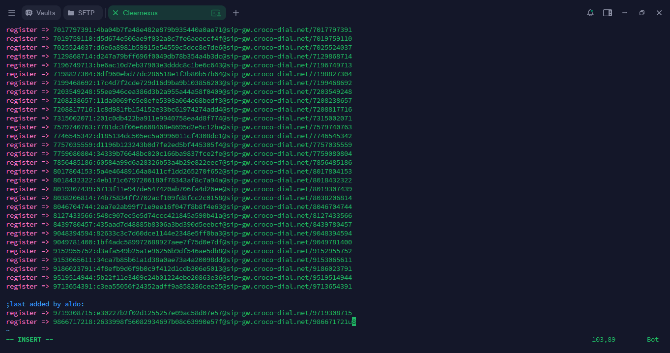 Press the “I” key. The word “INSERT” will appear at the bottom of the screen, allowing you to add the registration entries exactly as they were configured in the extension.